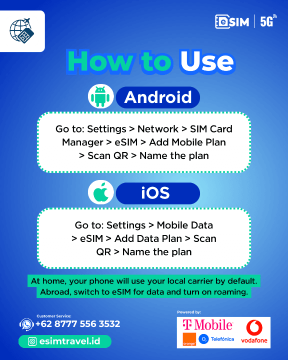 Setelah menerima QR Code melalui email, Anda hanya perlu membuka pengaturan ponsel, pilih menu “Tambahkan eSIM” atau “Add Cellular Plan”, kemudian scan QR Code tersebut. Dalam beberapa menit, koneksi internet akan aktif secara otomatis dan siap digunakan.