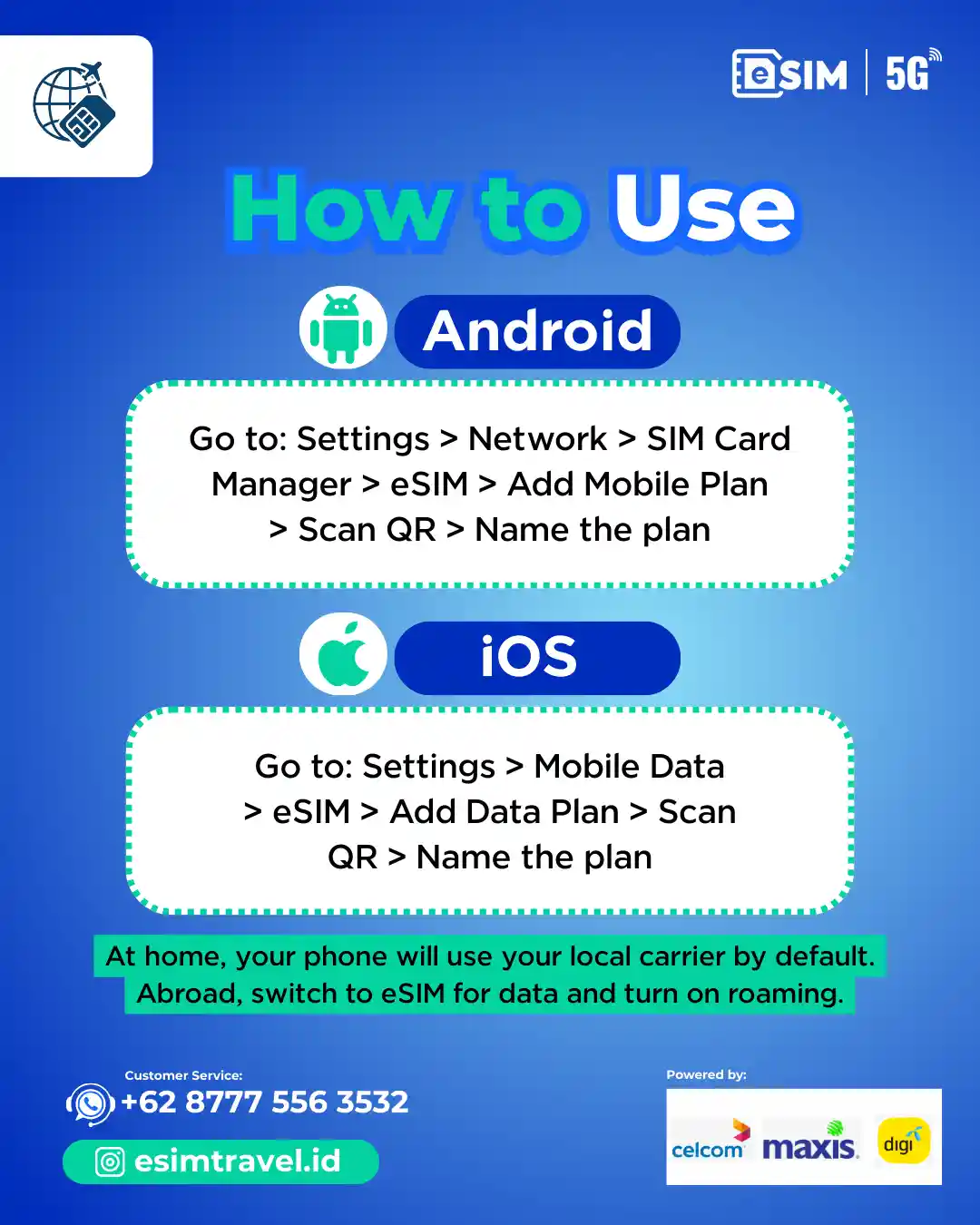 Bagi pengguna iPhone, Samsung, atau Google Pixel terbaru, proses ini hanya memerlukan beberapa langkah saja. Begitu selesai, Anda sudah bisa langsung browsing, streaming, atau mengakses peta digital untuk menjelajahi destinasi wisata favorit Anda di Malaysia.